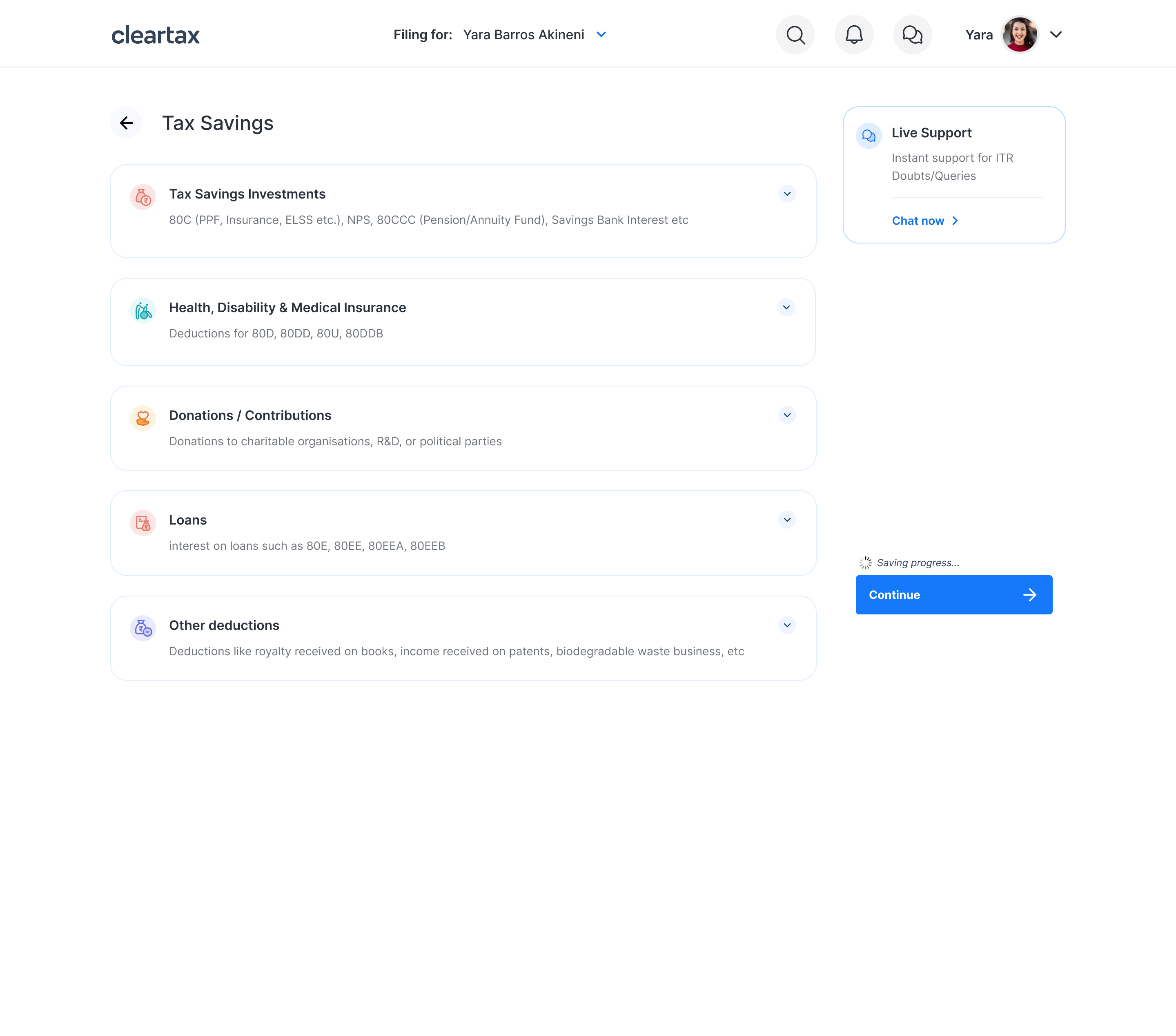 Under the ‘Tax Savings’ tab, review the investment details (e.g. LIC, PPF, etc.) captured. If you want to add more tax-saving details, you can edit the fields and claim tax benefits here.